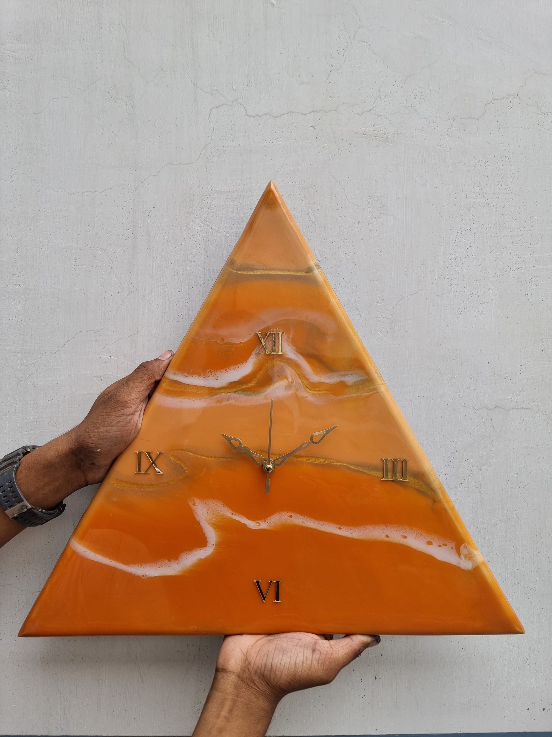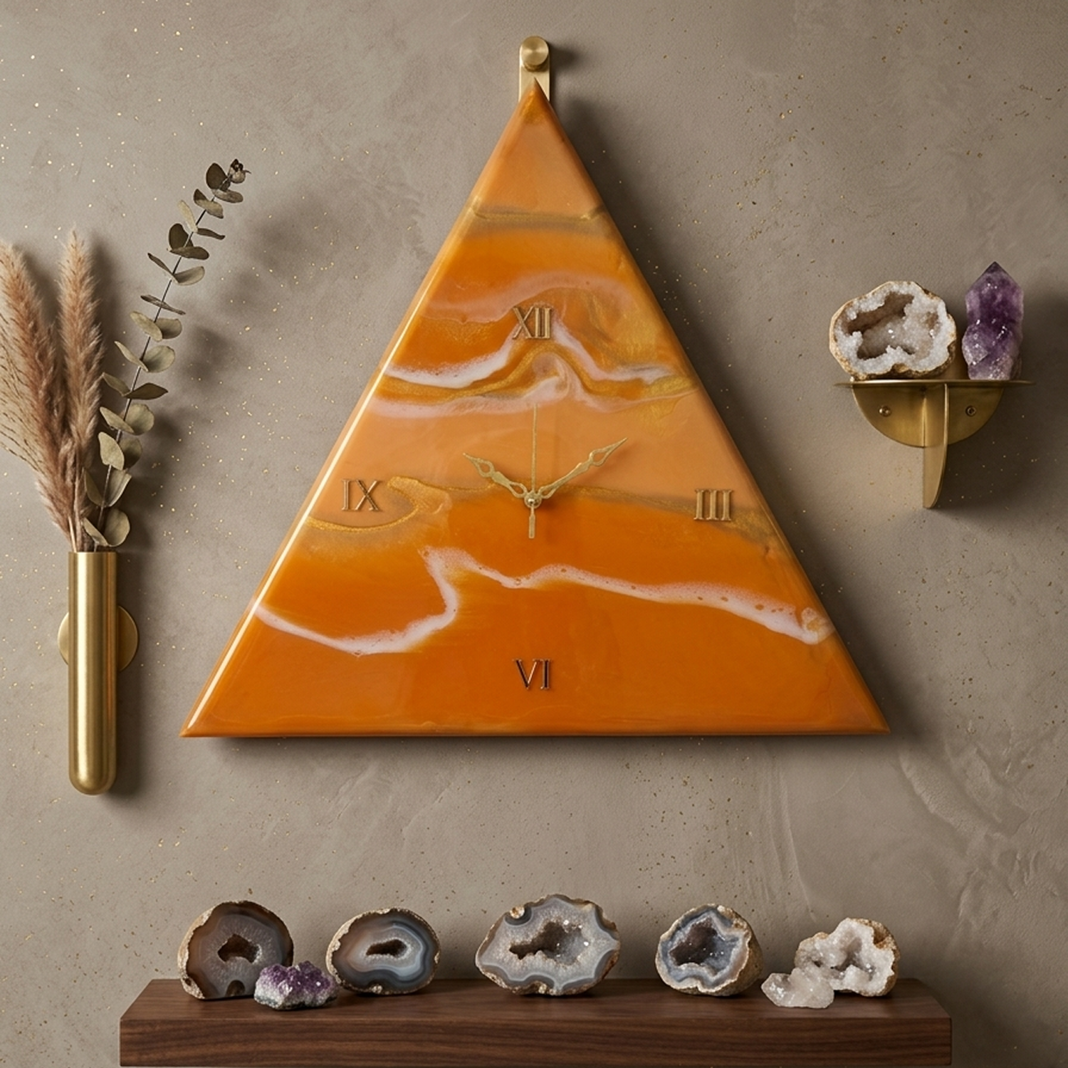Invite the warmth of a setting sun into your home with The Amber Prism Clock. This exquisite timepiece combines the rich, honeyed tones of natural amber with the sharp, reflective beauty of a prism. Hand-poured with premium resin and infused with golden metallic pigments, this clock glows with an internal light that shifts and shimmers as you move through the room.